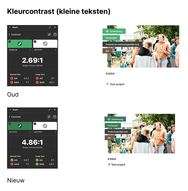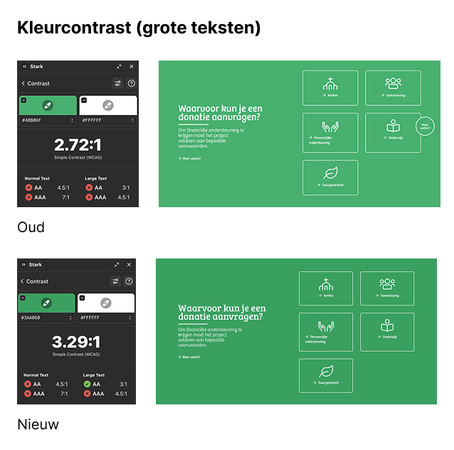 Voor headings gelden andere contrastvereisten dan voor kleinere teksten. Daarom hebben we twee verschillende voorbeelden en bijbehorende kleuren toegevoegd.